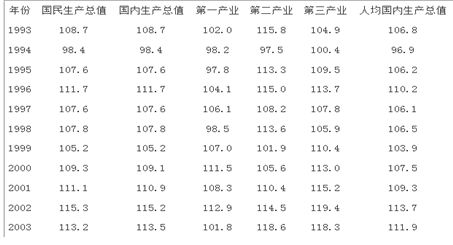 由图可知,除了1993年和1998年外,第三产业的指数都高于人均国内生产总值。