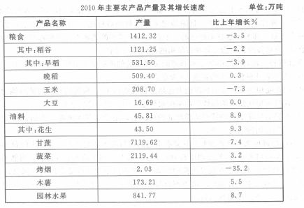 年减产3.5%。油料产量45.81万吨,增产8.9%;甘蔗产量7119.62万吨,增产7.4%;蔬菜产量2119.44万吨,增产3.2%;园林水果产量841.77万吨,增产8.7%。